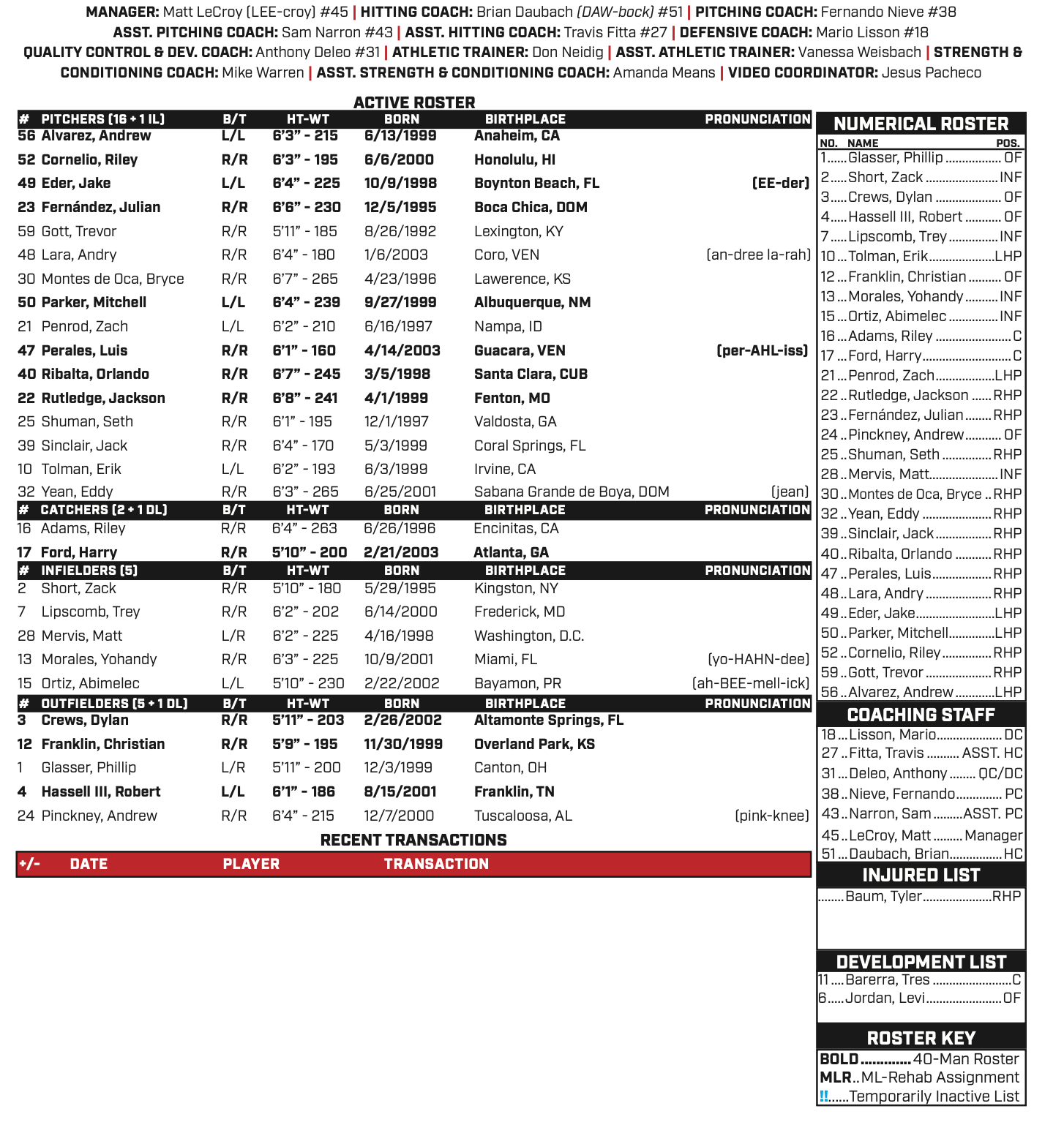 The roster also features several high‑profile prospects. Washington Nationals No. 3 prospect (MLB.com) Harry Ford is set to join the Red Wings after being acquired from Seattle in December, alongside No. 6 prospect Luis Perales, who was added in a separate December trade with Boston. Former No. 2 overall pick Dylan Crews will also begin the season in Rochester after appearing in 85 games with the Nationals during the 2025 season.