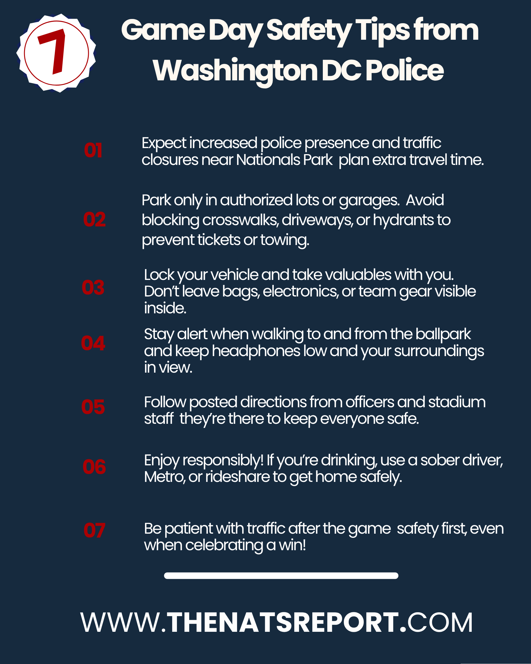 In a written statement to The Nats Report, the Metropolitan Police Department said it "will have an increased presence around the Washington Nationals baseball games. Residents and visitors will see numerous traffic closures in place during the games." The statement continued: "We want everyone to enjoy themselves when they attend these games and we would like to remind everyone of a few tips to keep them safe."