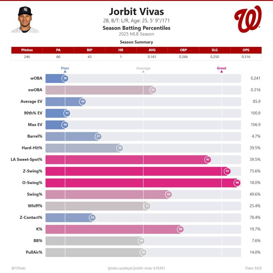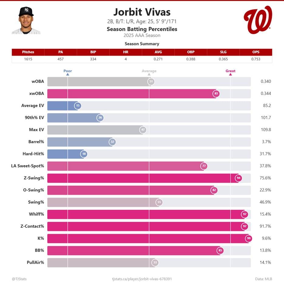 Jorbit Vivas is a 25-year-old second/third baseman who is known for his ability to generate contact. Originally signed by the Los Angeles Dodgers in International Free Agency, he was traded to the Yankees before the 2024 season. In 2025, Vivas made his MLB debut, playing 29 games, though not finding much success with a 52 wRC+.